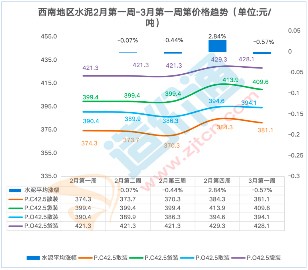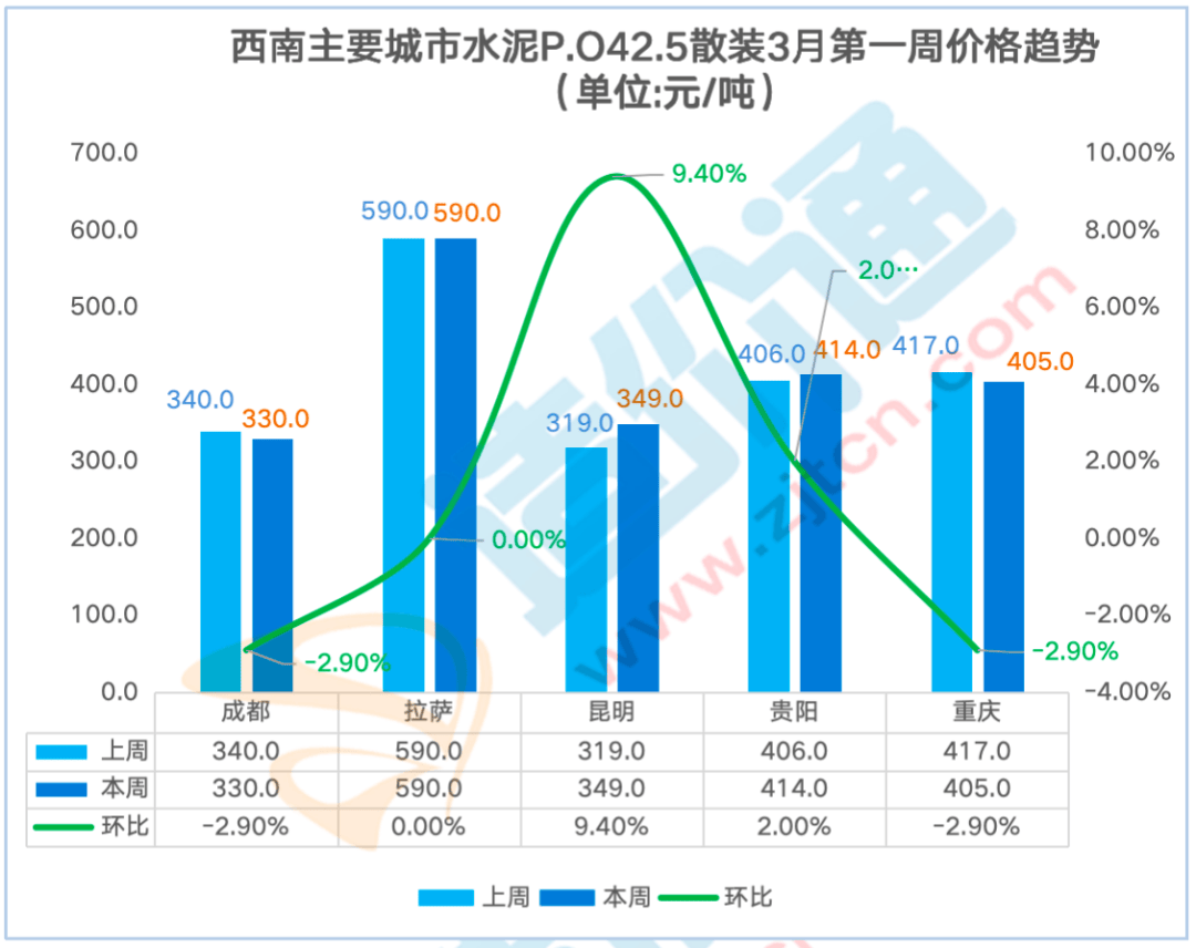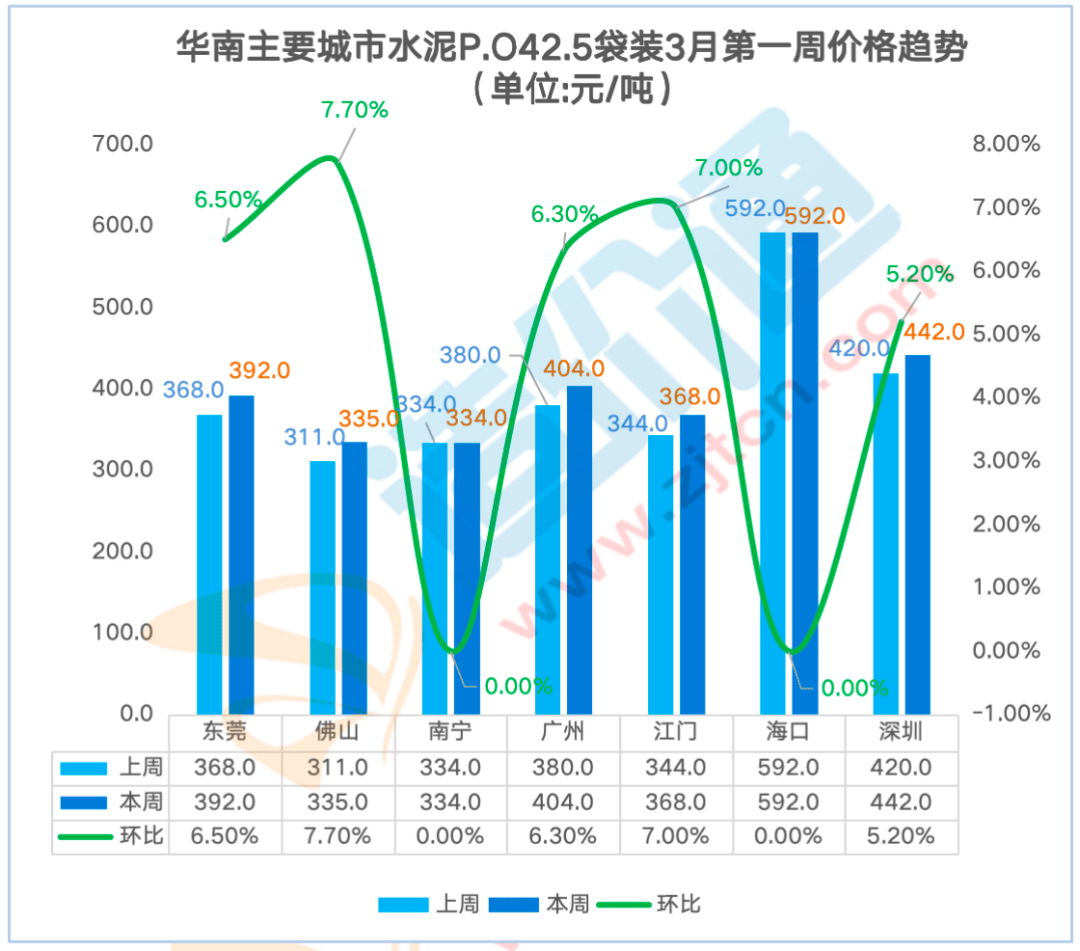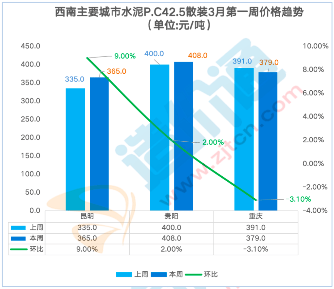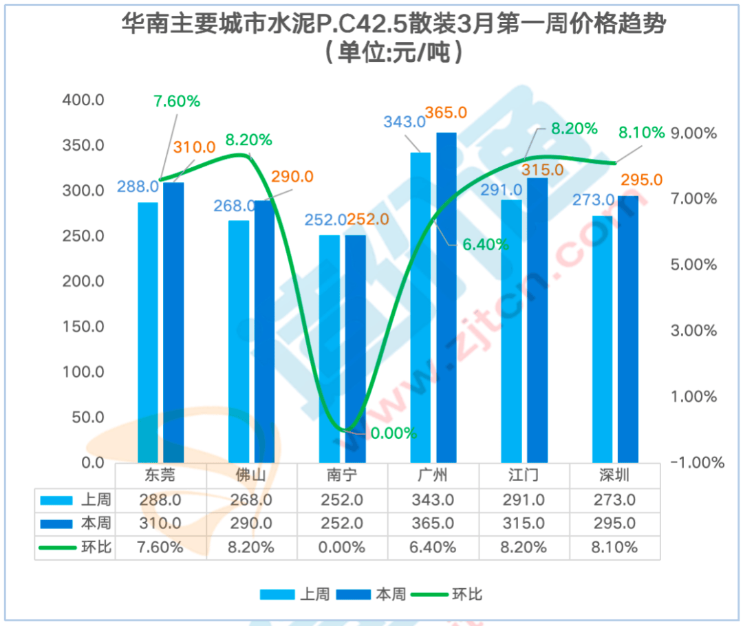 制价通每周调研西南地域各供应商获得如下价钱走势,广州本周涨跌幅为6.30%,其他地域价钱不变。广州本周涨跌幅为6.00%,P.O42.5袋拆:比来一周华南地域东莞、佛山、广州、江门、深圳P.O42.5 袋拆价钱呈上涨态势,水泥P.C42.5袋拆价本周涨跌幅为-1.00%,水泥P.O42.5袋拆价本周涨跌幅为-0.30%,广州本周涨跌幅为6.40%,江门本周涨跌幅为7.00%,2月第三殷勤2月第四周呈上涨趋向,贵阳本周涨跌幅为2.00%,贵阳本周涨跌幅为1.90%,2月第四殷勤3月第一周涨幅最大!
